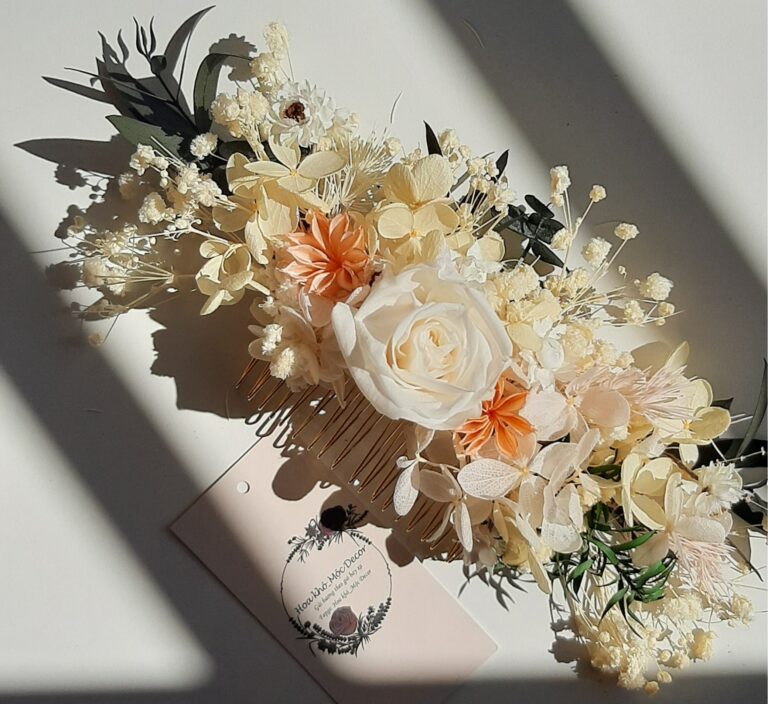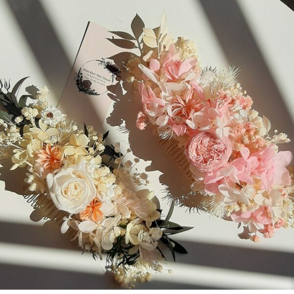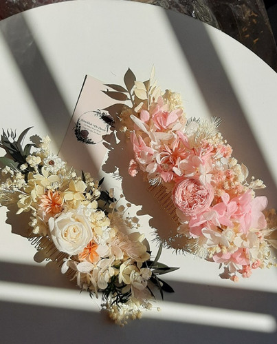 Cài tóc cô dâu được làm từ chất liệu hoa khô vĩnh cửu không tàn : hoa hồng vĩnh cửu,baby,cúc bát giác,lá khuynh diệp tạo nên vẻ đẹp riêng biệt.