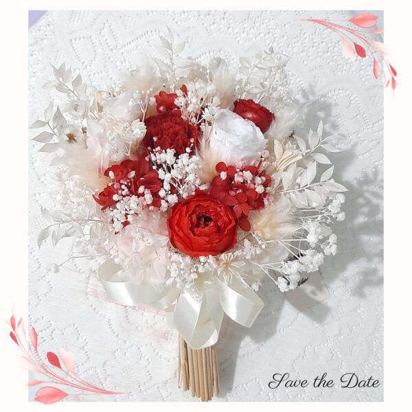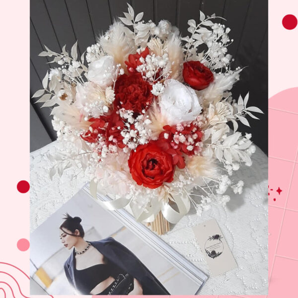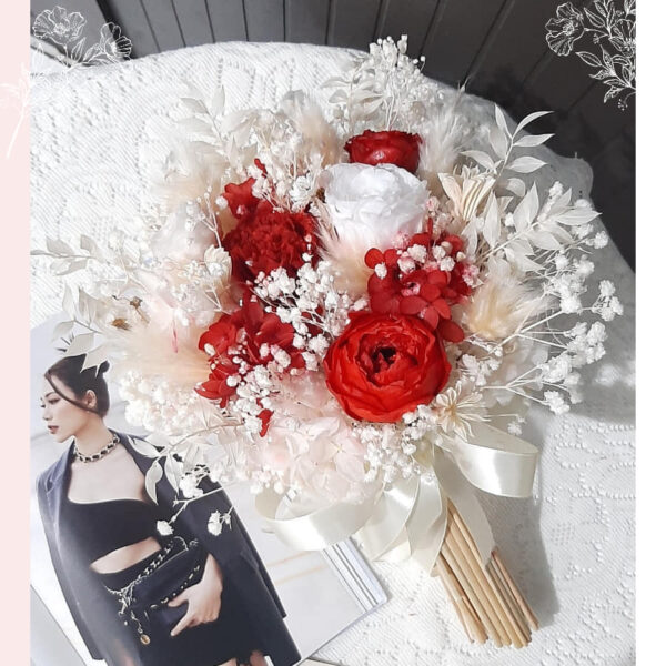 Tất cả là hoa khô không tàn hay còn gọi là hoa vĩnh cửu,bó hoa cưới từ hoa khô vĩnh cửu lưu giữ được rất lâu sau ngày cưới.