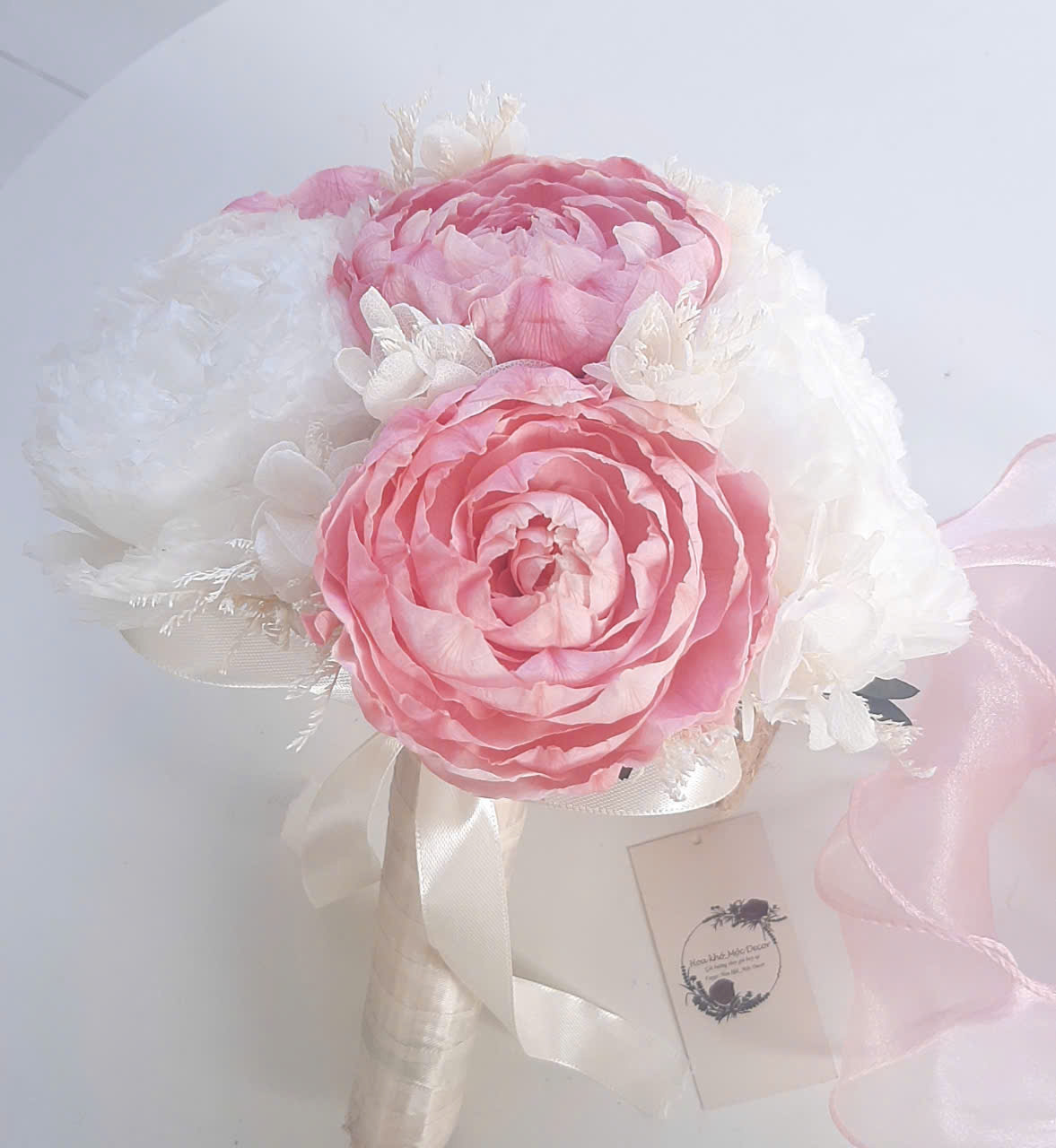 Bó hoa cưới từ chất liệu hoa khô gồm baby,cẩm tú cầu , Cúc hana và hoa hoa hồng